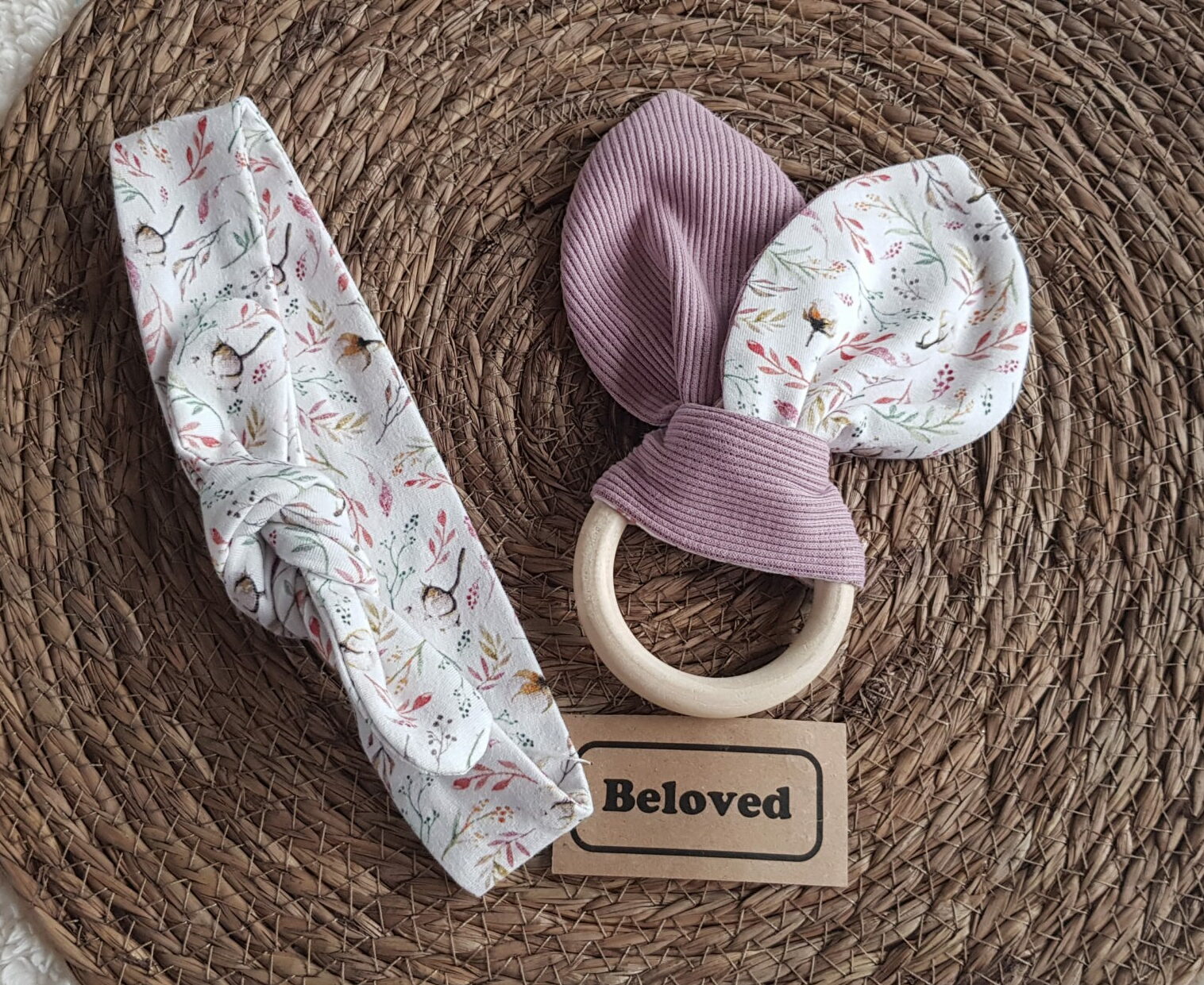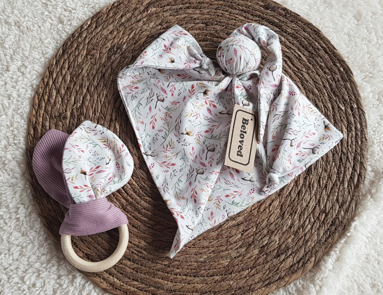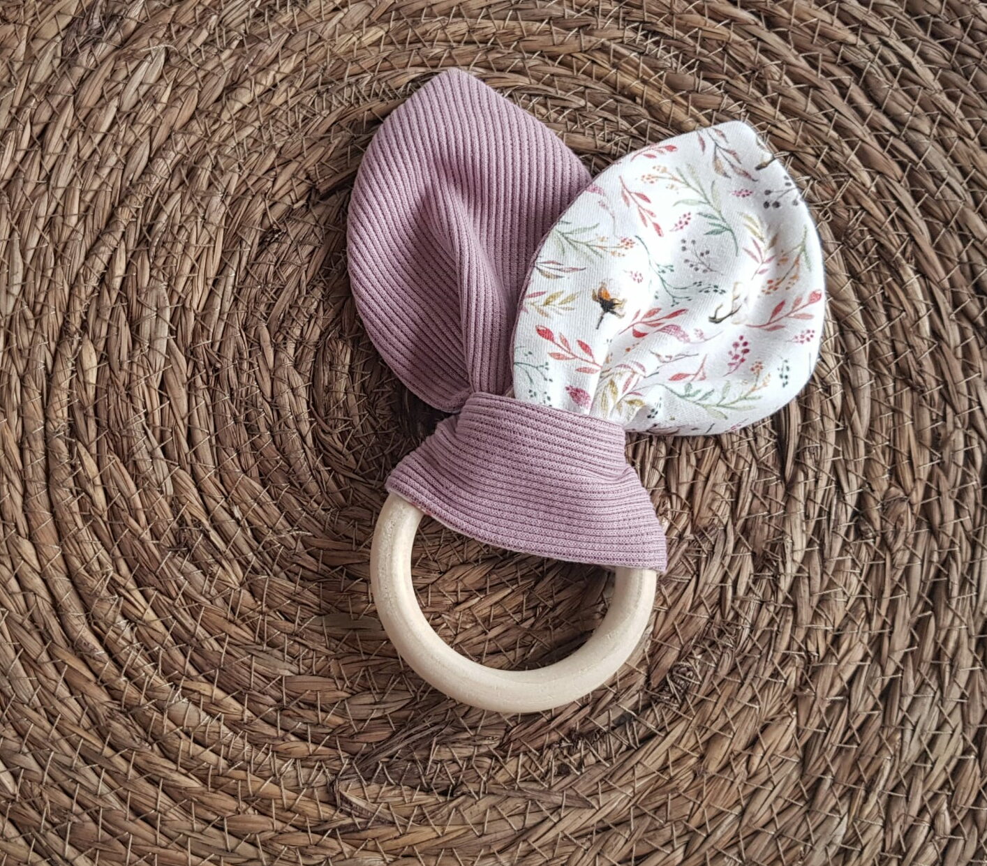 Leuke bijtring met katoenplantjes-print. De bijtring is gemaakt van gecertificeerd hout. De knuffeloortjes zijn verwijderbaar en wasbaar.