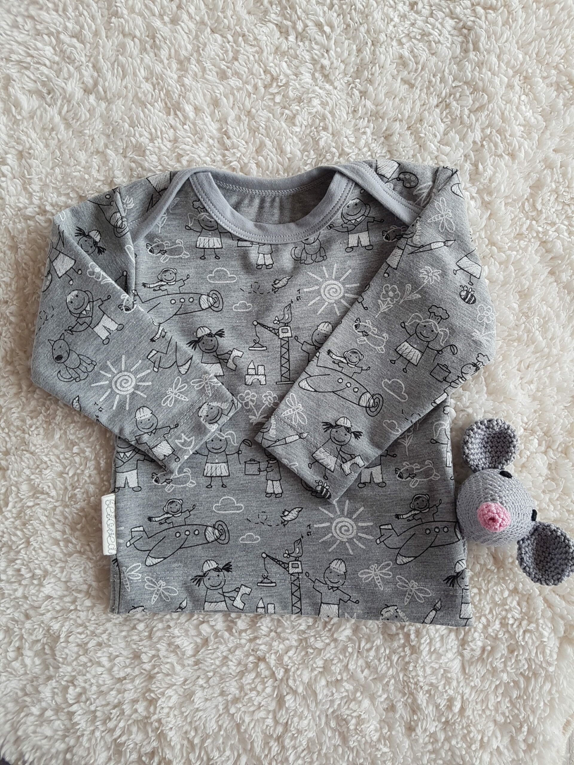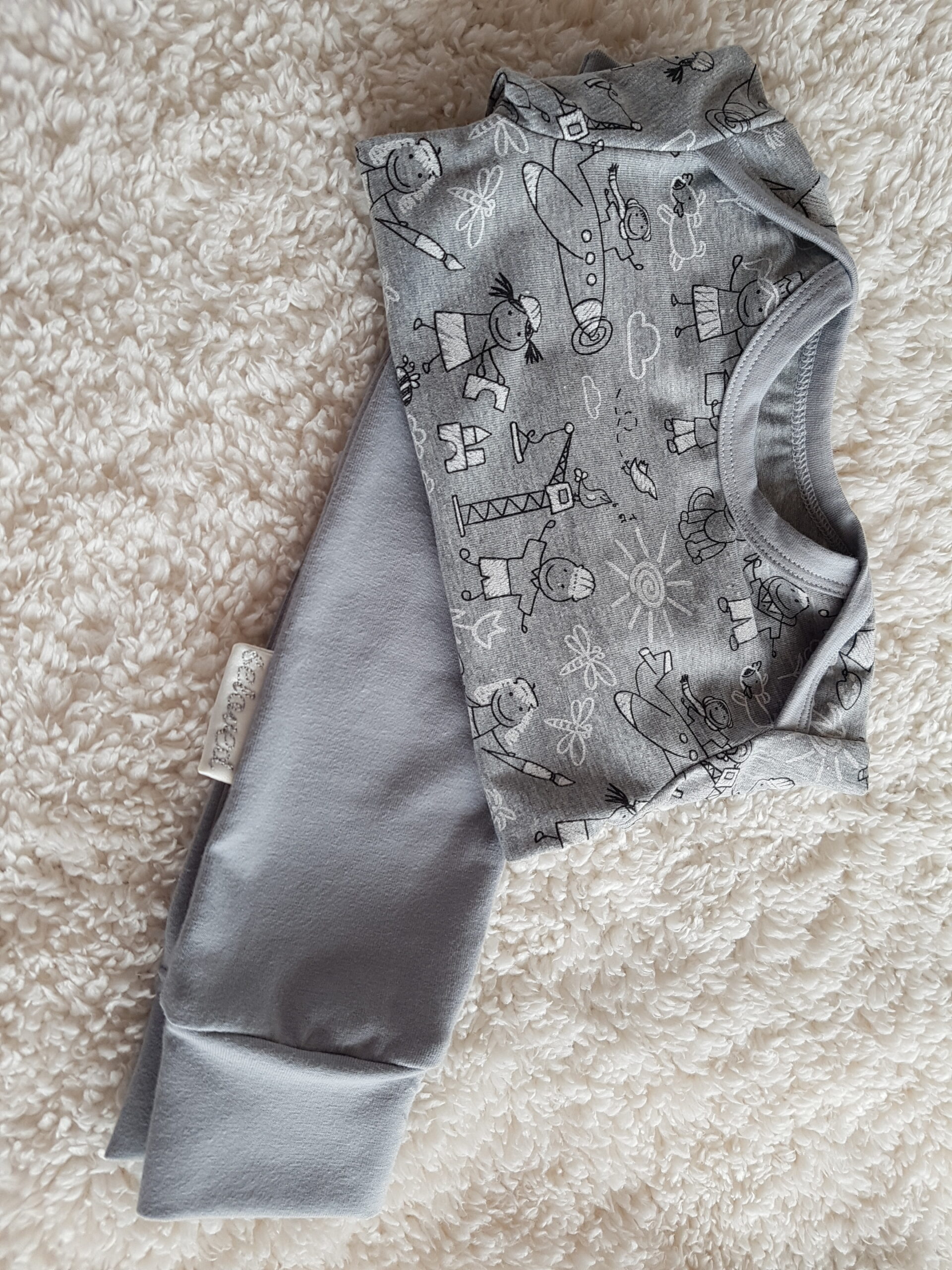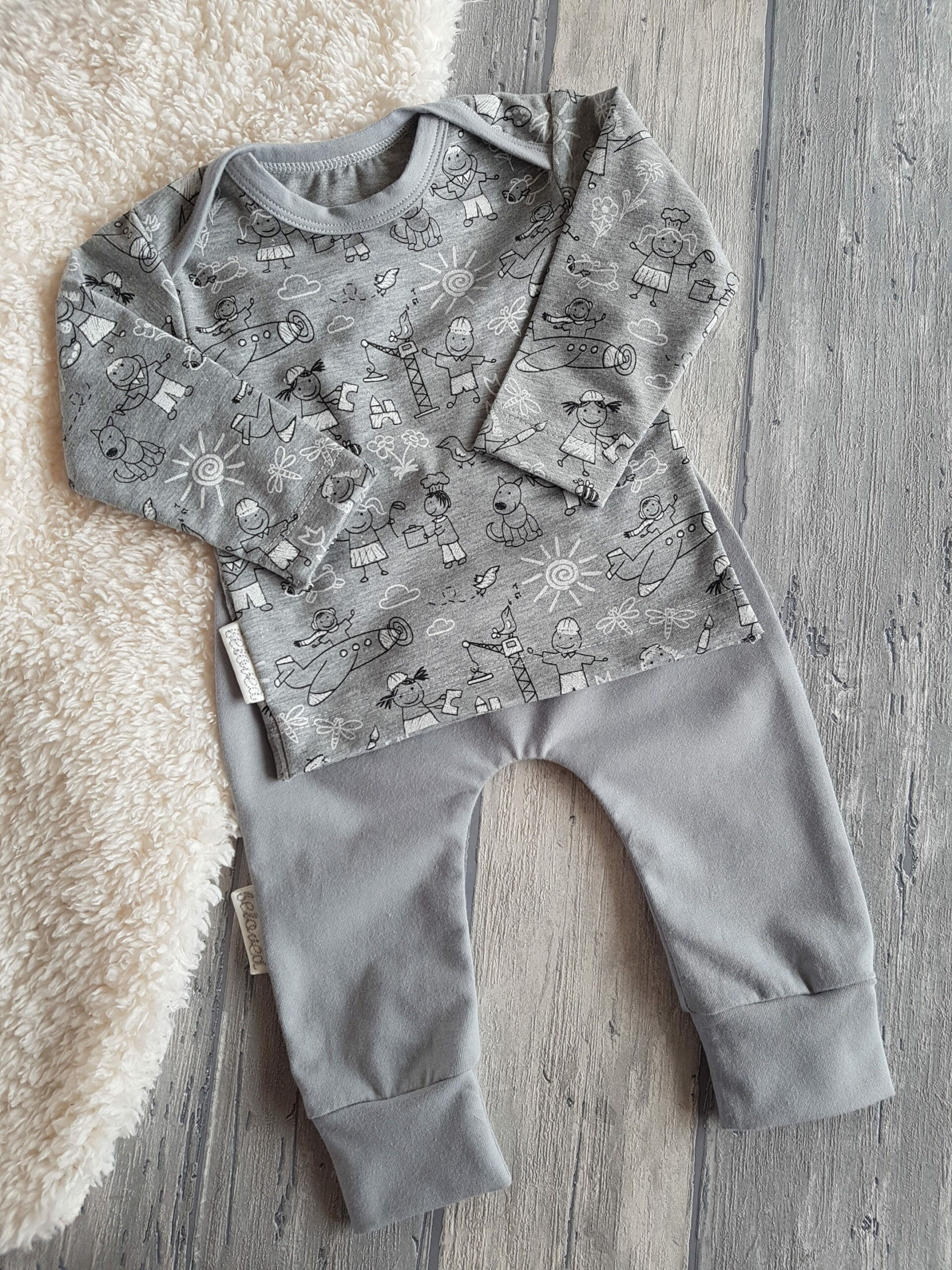 Leuk kledingsetje wat leuk is voor zowel een jongentje als meisje. Het is gemaakt van tricotstof, dus heerlijk om de dragen. Het shirt is afgebiesd met de stof van de broek. Het heeft een enveloppehals, wat het aantrekken zo makkelijk mogelijk maakt.