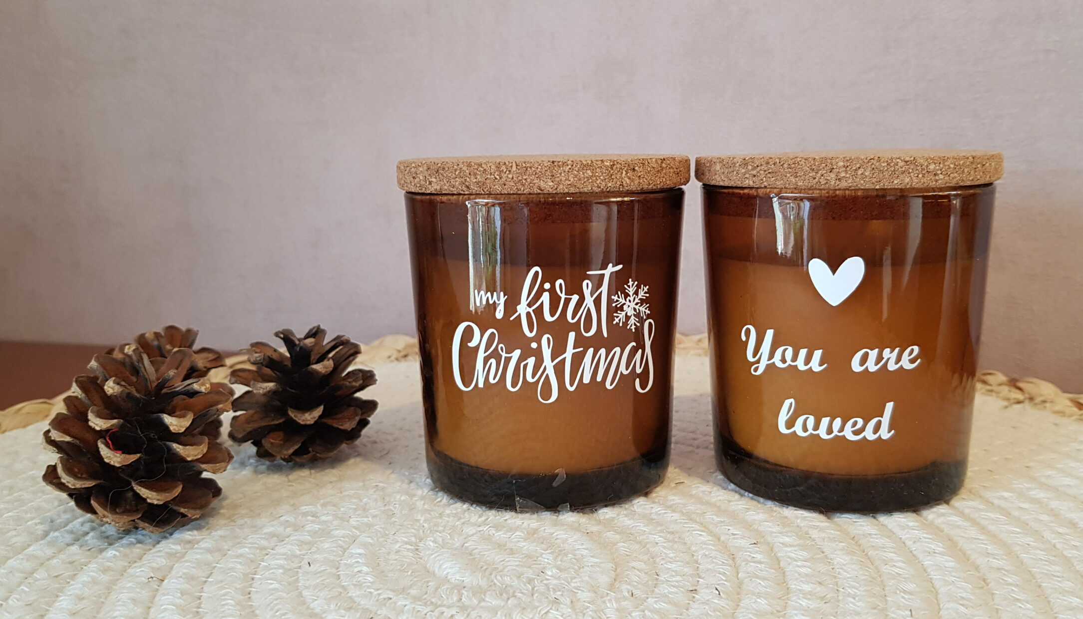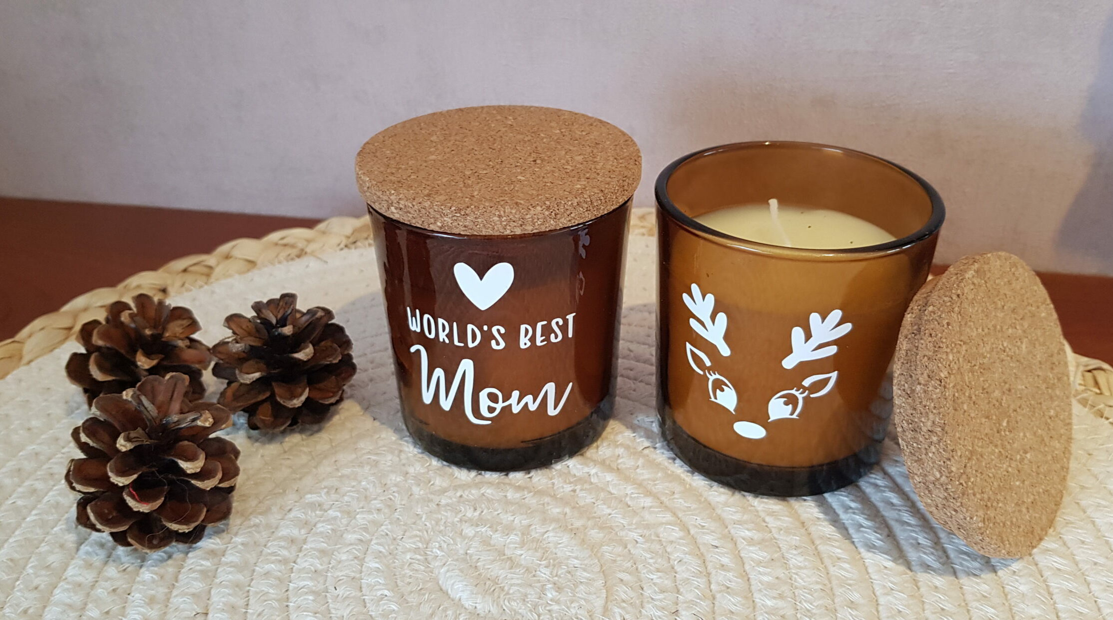 Leuk bruin kaarsje in glas, met deksel van kurk.