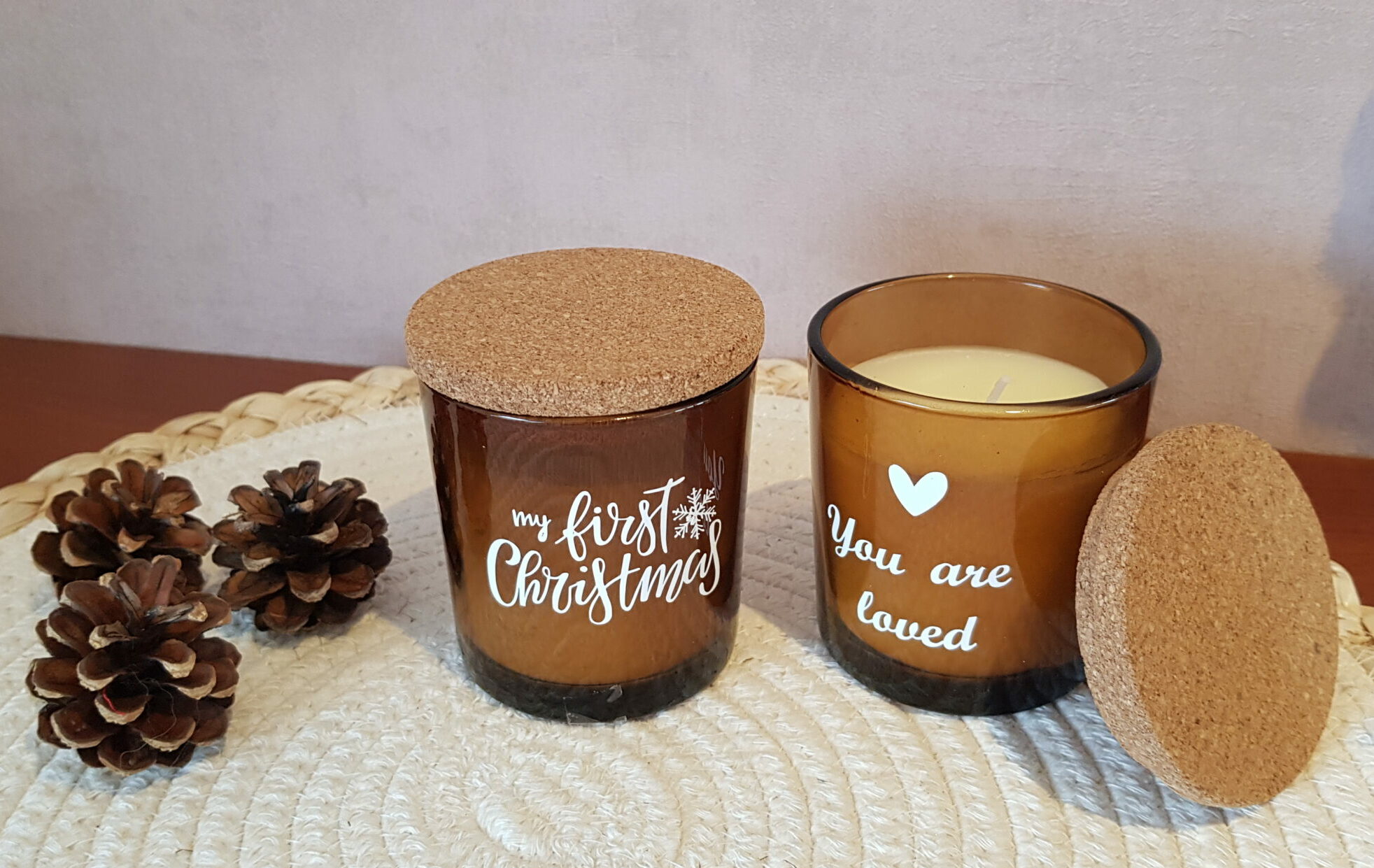 Leuk bruin kaarsje in glas, met deksel van kurk.