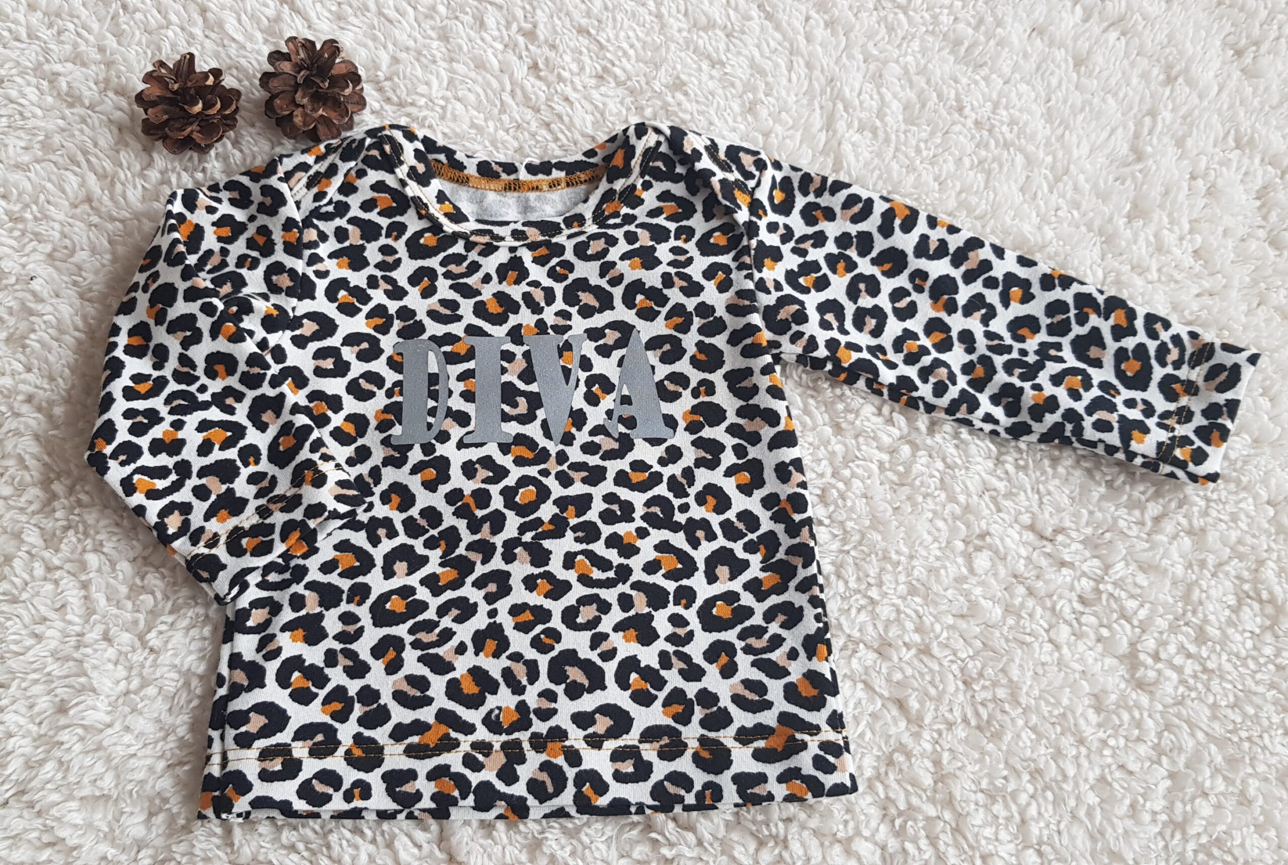 Een shirt voor een echte Diva! In fijne tricot met panterprint. op het voorpand staat een print: Diva